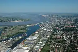 | Links Weser und Hafenbecken, mittig die Straße, rechts Wulsdorf | |