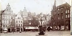 Brunnen | Der Brunnen befindet sich etwas westlich des Mittelpunktes des Marktes. Es ist eine Kopie, das Original befindet sich im Museum für das Fürstentum Lüneburg. Erschaffen wurde der Brunnen um 1540. Über zwei Schalen befindet sich eine Säule und darüber eine Statue der Göttin Artemis. Der bekrönende Halbmond wurde 1970 gestohlen, von Harald Haacke später nachgebildet. | 30666076 |