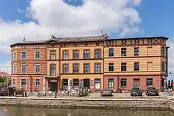 Das dreieinhalbgeschossige Haus wurde im Jahr 1877 errichtet. Die Fassade ist mit rotem und gelbem Backstein gegliedert und gebändert.