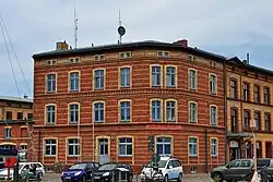 Das dreieinhalbgeschossige Haus wurde im Jahr 1877 errichtet. Die Fassade ist mit rotem und gelbem Backstein gegliedert und gebändert. Die Eckachse ist abgeschrägt.
