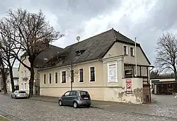 Der Hof entstand im frühen 19. Jahrhundert und besteht aus einem Wohnhaus und Wirtschaftsgebäuden. Das eingeschossige Wohnhaus ist traufständig zur Straße hin ausgerichtet. Die Gestaltung setzt die Bauformen des Spätbarocks fort. Die straßenseitige Fassade ist siebenachsig. Bedeckt ist der Bau mit einem Krüppelwalmdach. Westlich schließt sich, giebelständig zur Straße ausgerichtet, ein großes Wirtschaftsgebäude an.