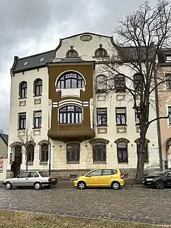 Das dreigeschossige Wohnhaus entstand im Jahr 1906. Die repräsentative Gestaltung erfolgte in Formen des Jugendstils. Die Fassade ist asymmetrisch ausgeführt und knickt in ihrem linken Teil etwas ab. Besonders geprägt wird das Erscheinungsbild durch einen breiten Erker vor den Obergeschossen.