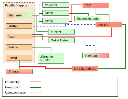 Vom Potenzial gewinnen nur der musikbesessene Wuschel und Michas bester Freund Mario Kontur. Wuschels besessene Suche nach dem Rolling-Stones-Album Exile on Main Street nimmt groteske Züge an. Am Ende des Romans verdankt er der Platte während eines „Zwischenfalls“ an der Mauer sein Leben. Der rebellische Mario hingegen erweist sich im Romanverlauf als ein „Revolutionär“, wenn auch dies wieder satirisch gebrochen wird. So führen seine „systemgefährdenden“ Aktionen zu keiner Veränderung, verdeutlichen aber den Sinn des Begriffs Potenzial. Der Ost-West-Konflikt beherrscht die dargestellte Wirklichkeit nur am Rande, so etwa, wenn Micha und Mario vor einem mit Westtouristen besetzten Bus hungernde DDR-Bürger spielen. Sie zeigen damit, dass sie den spielerischen Umgang mit gängigen Ost-Stereotypen sicher beherrschen. Westdeutsche Ignoranz verkörpert Onkel Heinz, die Westverwandtschaft der Familie Kuppisch. Onkel Heinz kritisiert den Osten, versucht aber durch vermeintliche Schmuggelaktionen die Situation der Familie zu verbessern. Am Ende stirbt er an Lungenkrebs. Und Frau Kuppisch vollbringt Heinz’ letzte Schmuggelaktion, indem sie ihn/seine Asche in einer Büchse Kaffee über die Grenze bringt.