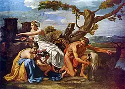 Rhea brachte das Kind Zeus zur Welt, doch nach einigen Tagen stand Kronos vor der Höhle und verlangte, dass ihm Rhea das Kind ausliefere. Rhea reichte ihm einen in blutige Windeln gewickelten Stein, den Kronos sofort verschlang. Anschließend forderte er Rhea auf, sofort mit ihm zu kommen. Sie begleitete ihn eine Weile, gab dann vor, noch schwach von der Geburt zu sein, ließ Kronos vorausgehen und lief zurück. In der Nähe der Höhle spielten an einem Bach Nymphen, die das Kind weinen hörten und sofort in die Höhle gingen. Eine Nymphe hatte das Kind auf dem Arm, als Rhea zurückkam. Sie bat die Nymphe, sich um ihren Sohn Zeus zu kümmern, und verwandelte sie in eine göttliche Ziege, damit sie das Kind mit Milch, Ambrosia und Nektar ernähren konnte.
