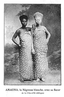 Erstens wurde sie „stets in Differenz repräsentiert, in Begleitung einer dunkelhäutigen Person“.[20] Amanua Kpapo und eine der beiden weiteren Ehefrauen von Nayo Bruce, Yenoussi Johnson oder Dassi Creppy, traten häufig als vermeintliches Geschwisterpaar auf und trugen die gleiche Frisur sowie einen gleichgemusterten, schulterfreien Umhang.[7] Auf der einen Seite irritierte diese Gegenüberstellung, da so die „Sichtbarkeit und Eindeutigkeit von Haut- und Haartönen, die im Konzept von Rasse wesentlich sind, versagen.“[21] Auf der anderen Seite wurden schwarze Menschen mit Albinismus – trotz weißer Haut – aus Sicht der europäischen Zuschauer dennoch als Nicht-Weiße wahrgenommen. „Sie erschienen als eigenartige, komische, burleske oder bizarre Figuren, welche die ‚Rassengrenzen‘ trotz ihrer Übertretung nicht auflösten, sondern stabilisierten.“[19]