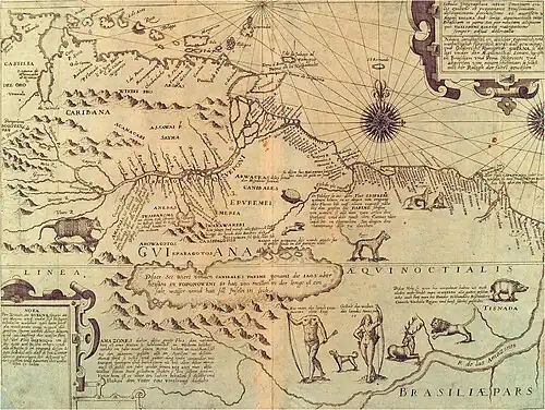 Die Herkunft des Namens Amazonas ist nicht vollständig geklärt. Meist wird er darauf zurückgeführt, auf der Reise des Francisco de Orellana (der 1540 mit der Gonzalo-Pizarro-Expedition von Ecuador her aufgebrochen war und im Januar 1542 den heutigen Amazonasstrom erreichte und als Erster bis zur Atlantikmündung durchfuhr)[19] hätten die spanischen Entdecker indianische Kriegerinnen gesehen und den Fluss daher nach den sagenhaften Amazonen benannt. Der Chronist der Expedition, der Dominikaner Gaspar de Carvajal, schildert in seinem Reisetagebuch[22] die angeblich im Juni 1542 stattgefundene Begegnung mit „sehr hellhäutigen und groß gewachsenen Frauen, die ihr sehr langes Haar zu Zöpfen geflochten um den Kopf gewickelt tragen und sehr stämmig gebaut sind.“[23] Sie kämpften wild und entschlossen[24] „wie Anführer an der Spitze der Indios“.[25] Später verhörten die Spanier einen gefangenen Indianer, der von den eigentümlichen Lebensgewohnheiten dieser Kämpferinnen berichtet haben soll.[26] Daraufhin habe Orellana sich entschlossen, den Fluss „Strom der Amazonen“ zu nennen.