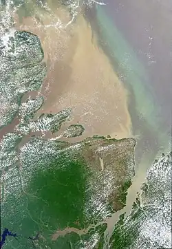 Die Mündung des Amazonas bildet ein großes Ästuardelta.[38] Es besteht aus den Flussarmen Canal Norte (40 % des Abflusses[4]) und Canal Sul (56 % des Abflusses), die sich zu Ästuaren aufweiten und zusammen ein Delta bilden, dessen Sedimentablagerungen sich im Schelfbereich vor der Küste den Kontinentalhang hinabziehen.