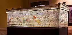 Der bemalte Amazonensarkophag (71 cm × 194 cm × 62 cm) wurde im Jahr 1869 bei Tarquinia – damals Corneto genannt – entdeckt.[1] Der etruskische Sarkophag datiert in das vierte Jahrhundert v. Chr. Die Malereien gelten als Meisterwerk antiker Kunst und werden oftmals einem griechischen Maler zugesprochen. Der Sarkophag befindet sich heute im Archäologischen Nationalmuseum Florenz (Inv. Nr. 5811). Nach der Inschrift auf dem Deckel war darin eine Frau namens Ramtha Huzcnai bestattet. Sie war die Mutter oder Großmutter des Beamten (zileteraias) Larth Apaiatru.