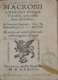 - ↑ Zur korrekten Reihenfolge siehe Alan Cameron: The Date and Identity of Macrobius. In: The Journal of Roman Studies 56, 1966, S. 25–38, hier: 26; Mireille Armisen-Marchetti (Hrsg.): Macrobe: Commentaire au Songe de Scipion, Bd. 1, Paris 2003, S. VIII; Bruce C. Barker-Benfield: The manuscripts of Macrobius’ Commentary on the Somnium Scipionis, Oxford 1975, S. 3.