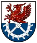 Blasonierung: „Geteilt von Silber und Blau. Oben ein wachsender roter Greif, unten ein halbes silbernes Wassermühlenrad.“ |