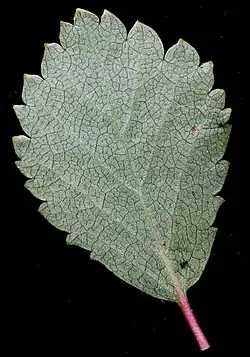 Die wechselständig angeordneten Laubblätter sind in Blattstiel und -spreite gegliedert. Der Blattstiel ist 2 bis 3 Millimeter lang. Die einfache Blattspreite ist bei einer Länge von 2,5 bis 5 Zentimetern sowie einer Breite von 1 bis 5 Zentimetern elliptisch bis verkehrt-eiförmig mit stumpfem oberen Ende und gerundeter oder breit-keilförmiger Spreitenbasis und grob gesägtem Rand. Die Blattoberseite ist mehr oder weniger behaart, die -unterseite weißlich und meist dicht behaart, zuletzt jedoch oft kahl. Je Blattspreite sind vier bis sechs Nervenpaare vorhanden.[1][2]