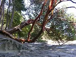Der Amerikanische Erdbeerbaum (Arbutus menziesii) ist eine Pflanzenart der Gattung der Erdbeerbäume und einer der wenigen Laubbäume des amerikanischen Nordwestens. Kennzeichnend sind die leuchtend rotbraune, abblätternde Rinde und die ledrigen, glänzend grünen Blätter, die sich im Frühsommer purpurrot verfärben.[1] Ein Höchstalter zwischen 200 und 250 Jahre ist mehrfach nachgewiesen worden, besonders starke Bäume schätzt man als doppelt so alt ein.[2]