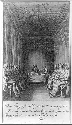 Der Stich zeigt eine Versammlung des Kontinentalkongresses.