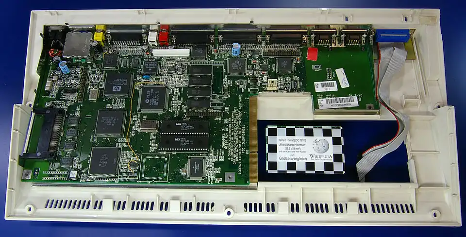 Auf der Unterseite besitzt der Rechner schließlich einen CPU-Erweiterungssteckplatz, die sog. trapdoor (dt. „Falltür“) mit zwei internen Schnittstellen, die durch eine Abdeckung vor Staub geschützt sind.[25] Dabei handelt es sich um einen 44-poligen AT-IDE-Pfostenstecker zum Betrieb von internen IDE-Festplatten sowie um einen 150-poligen lokalen Prozessorbus zum Einstecken von Turbokarten mit zusätzlicher CPU.[24]