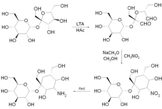 Es gibt verschiedene Wege, Aminozucker herzustellen. Eine Methode ist eine Ringschlussreaktion vom Aldoltyp zwischen Dialdehyden und Nitroalkanen. So kann etwa Saccharose zuerst mit Blei(IV)-acetat und Essigsäure am Ring der Fructofuranose-Untereinheit oxidativ gespalten, jener anschließend wieder über Reaktion mit Nitromethan unter Präsenz von Natriummethanolat und Methanol geschlossen und anschließend die Nitrogruppe zur Aminogruppe reduziert werden.[13]