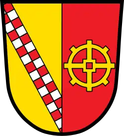 Blasonierung: „Gespalten von Gold und Rot; vorne ein in zwei Reihen von Rot und Silber geschachter Schrägbalken, hinten ein goldenes Mühlrad.“[39] |