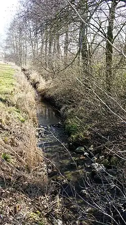 - (Anderer Quellarm), von links und Norden auf etwa 467 m ü. NHN etwa 400 Meter westlich des Ortsrandes von Grimmschwinden, ca. 0,5 km[BA 3] und ca. 0,5 km².[BA 4] Entspringt auf etwa 474 m ü. NHN nordwestlich von Grimmschwinden am Fuß des Ochsenbergs (536 m ü. NHN[BA 5]). Der Namensquellarm ist am Zusammenfluss ebenfalls ca. 0,5 km[BA 3] lang, hat aber ein Einzugsgebiet von schon ca. 0,6 km².[BA 4]