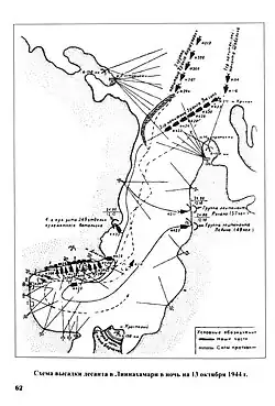 Der Durchbruch der gelandeten Truppen zum Hafen begann am späten Abend des 12. Oktober. Ausgangspunkt der Abteilung war die Fischerhalbinsel (russisch: Poluostrow Rybatschi, finnisch: Kalastajansaarento). Die Landungstruppe bestand aus dem 349. separaten Maschinengewehr-Bataillon unter Major I. A. Timofeew, dem 125. Marineinfanterie-Regiment und weiteren Freiwilligen der Marineschiffe mit zusammen etwa 660 Mann. Am Angriff nahmen insgesamt 14 Schnellboote teil: Die Erste Abteilung mit 2 Torpedobooten unter Kapitänleutnant A. O. Schabalin bildete voraus einen durch eine Rauchwand geschützten Korridor, innerhalb dessen die zweite Abteilung mit 5 Torpedobooten unter Kapitän 2. Ranges S. G. Korschunowitsch und die dritte Abteilung mit 1 Torpedoboot und 6 Patrouillenbooten unter Kapitän 3. Ranges S. D. Sjusin nachfolgten.