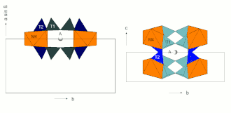 Es ergeben sich zwei strukturell unterschiedliche SiO4-Tetraeder. Der Tetraeder T1 verbindet die beiden Zweier-Einfachketten zu einer Zweier-Doppelkette und ist über drei Sauerstoffe mit benachbarten SiO4-Tetraedern verbunden. Das Tetraeder T2 ist nur über zwei Sauerstoffe mit benachbarten SiO4-Tetraedern verbunden.