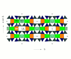 Diese I-Beams sind untereinander über die M4- und M2-Oktaeder verbunden, wobei die Ränder der Silikatdoppelketten an die M4- und M2-Oktaeder der benachbarten I-Beams gebunden sind.