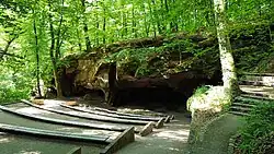 Die Ostseite des Theaters ist ein schönes Beispiel für einen Mühlsteinbruch. Es gibt sogar einige unvollständige Mühlsteine an der Wand, die nie fertiggestellt wurden. In der Umgebung gibt es jedoch noch viele weitere ähnliche Felsformationen mit aufwendig gestalteten Felswänden und Höhlen. Der Ort wird auch Hohllay genannt, wobei hohl eine Höhle bedeutet und lay ein mittelalterlicher Begriff für Fels ist.