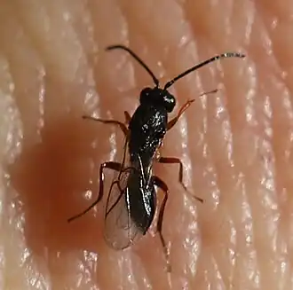Die Männchen erreichen eine Länge von 4 mm, die Weibchen sind gewöhnlich 4–5 mm lang.[2] Die Hautflügler sind dunkelbraun bis schwarz gefärbt. Das gewölbte, konvexe Mesosoma weist meist eine matte und lederartige Oberfläche mit einer charakteristischen Mikroskulptur auf.[2] Die Beinfärbung ist variabel und reicht von vollständig verdunkelt bis vollständig (hell) rötlich.[2] Der Kopf der Hautflügler ist relativ breit.[2] Die Hautflügler besitzen eine charakteristische Aderung der Vorderflügel.