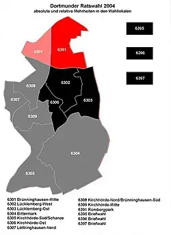 | Hombruch | 56.417 | +0,2 % | 52 % | 34,9 km² | 1615 | – | – | 7,8 % | 10,3 % |