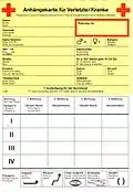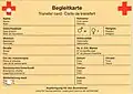 | Die Begleitkarte dient der Erstregistrierung unverletzt gebliebener Beteiligter. Sie ist ein Formularsatz aus drei Blättern, der im Durchschreibeverfahren ohne Kohlepapier ausgefüllt wird. Steht wenig Zeit zur Verfügung, so müssen, ausgenommen alleinstehende Kinder und alte Menschen, die Betroffenen die Karte selbst ausfüllen. | |||