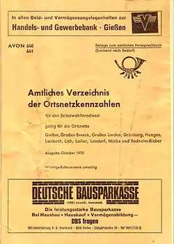 Die von jedem Ortsnetz im Selbstwählferndienst (SWFD) zugelassenen Ortsnetze waren Ende der 1960er Jahre in einem „Amtlichen Verzeichnis der Ortsnetzkennzahlen für den Selbstwählferndienst“ kurz: AVON enthalten, das dem amtlichen Fernsprechbuch bei der Ausgabe beigegeben oder den Fernsprechteilnehmern besonders übersandt wurde. Aus diesem Verzeichnis konnten die zum SWFD zugelassenen Ortsnetze der Bundesrepublik und eine Auswahl der zum SWFD zugelassenen Orte des Auslands mit den dazugehörigen Ortsnetzkennzahlen sowie Länderkennzahlen und die jeweilige Sprechdauer für eine Gebühreneinheit entnommen werden. Anfang der 1970er Jahre war auf der Vorderseite des Umschlags die Namen der Ortsnetze angegeben, für die das AVON gültig war, in der Regel handelte es sich dabei jeweils um die Ortsnetze des Bereiches einer Knotenvermittlungsstelle.[1] Später enthielt das AVON alle Ortsnetze der Bundesrepublik.