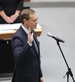 An der Stelle des Eides kann auch ein Gelöbnis abgelegt werden. Dabei werden die Worte „Ich schwöre vor Gott dem Allmächtigen“ durch „Ich gelobe“ und die Bekräftigung „Ich schwöre es“ durch „Ich gelobe es“ ersetzt.[50] Danach wird der Neugewählte als Bundesrat betitelt.