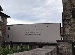 Zwischen dem Hauptgebäude und der Stiftskirche wurden drei Fragesätze des deutschen Philosophen und Kommunikationswissenschaftlers Siegfried J. Schmidt auf einer Fassade eingebracht. Die drei Begriffe „macht“, „recht“ und „moral“ werden von ihm permutativ als drei Fragesätze verwendet. Er stellt nur die Frage, die Antwort soll der Leser sich selbst geben.
