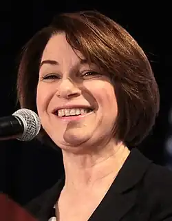 Klobuchar kündigte am 10. Februar 2019 ihre Kandidatur für die Präsidentschaftswahl 2020 an; bereits zuvor war sie als mögliche Kandidatin gehandelt worden.[3] Klobuchar galt als Vertreterin eines moderaten, pragmatischen Kurses und aufgrund ihrer Senatserfahrung und Beliebtheit im Mittleren Westen als chancenreich. Nachdem sie bei der Primary von New Hampshire den dritten Platz belegt hatte, bei den weiteren bis dahin gelaufenen drei Abstimmungen aber abgeschlagen war, erklärte sie am 2. März 2020 den Rückzug von ihrer Kandidatur. An diesem Vorabend des Super Tuesday sprach sie sich für Joe Biden aus.[4]
