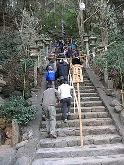 Als Priester Kūkai im Jahr 815 – 43 Jahre alt, das ist für einen Mann ein „Jahr der Gefahren“ (厄年, Yaku-doshi) – eine Pilgerreise durch das Land durchführte, kam er zum Berg Tachigi (立木山), als er eine Erleuchtung hatte. Er schnitzte daraufhin eine lebensgroße Kannon-Figur, die man dann verehrte. Dazu kam, dass die Kannon sich in ein Reh verwandeln kann. So hatte sie als Reh Kūkai den Weg zum Tachigi gezeigt, nachdem er den Fluss Setagawa (瀬田川) überquert hatte. Die Stelle, an der sie den seichten Fluss übersprungen hat, wird „Rehsprung“ (鹿跳, Shishitobi[A 1]) genannt.