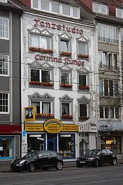 - Nr. 31: 4-gesch. Geschäfts- und Bürohaus mit verspielten Fassadenornamenten der 1900er Jahre; Tanzstudio