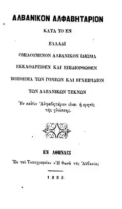 Im Jahr 1882 erschienen in Athen eine albanische Fibel (Avabatar arbëror pas përgluhës arbërore si flitetë nd' Ejadhë përqëruarë edhe parndrequrë me gërma të ra her' eparë nd' Eladhë shtypëshkruarë) und ein Lesebuch (Klumësht për foshnja) auf der Grundlage der griechischen Schrift. Letzteres war eine albanische und griechische Übersetzung nach einem englischen Werk von Samuel Schieffelin.