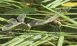 Auf der Suche nach einem Weibchen fliegen die Männchen ausdauernd hoch über der Wasserfläche entlang der Uferlinie und auch in die Ufervegetation. Die Eiablage erfolgt fast immer in Tandemstellung, wobei das Weibchen die Eier in lebende oder abgestorbene Pflanzenteile einsticht.[1]