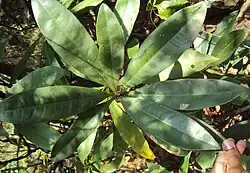Die wechselständigen Laubblätter sind an jungen Exemplaren in endständigen Rosetten, später an der Sprossachse spiralig verteilt oder gehäuft am oberen Bereich der Zweige angeordnet. Die Laubblätter besitzen keinen Blattstiel, aber durch die lang spitz zulaufende Basis der Blattspreite scheinen sie gestielt zu sein. Die einfachen Blattspreiten sind ganzrandig. Auf beiden Blattflächen sind wenige bis einige kleine Gruben verteilt, die jeweils ein einziges Trichom enthalten, das eine wachsige Substanz sezerniert.[1] Es liegt Fieder- und Netznervatur vor. Die actinocytischen Stomata befinden sich hauptsächlich auf der Blattunterseite.[2] Die Nebenblätter sind oft winzig sowie früh abfallend und scheinen oft zu fehlen.[1][2]