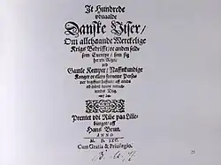 - ↑ Das Titelblatt in typischer Manier der Zeit: Einhundert ausgewählte dänische Lieder über allerhand merkwürdige Kriegsereignisse und andere seltsame Abenteuer, die sich hier im Reich mit alten Hünen, namhaften Königen und sonst vornehmen Personen begeben haben seit der Zeit Arilds bis zu diesem heutigen Tag. Gedruckt in Ribe auf dem Lilienberg von Hans Brun, Anno [1591], mit [königlicher] Gnade und Privileg. Auf dem „Lilienberg“ in Ribe, nahe dem Dom, befanden sich Vedels Haus und seine Privatdruckerei. ‚Seit der Zeit Arilds‘ ist (mit einem Vornamen altnordischer Herkunft) im Dänischen sprichwörtlich und bedeutet: seit Anfang der Zeiten, seit heidnischer Zeit u. ä.