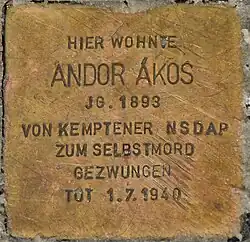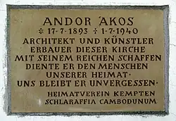 - ↑ Diese und die folgenden Fakten – soweit nicht gesondert vermerkt: Siehe Weber, Dieter: Andor Ákos. 1893–1940. Ein in Ungarn geborener Architekt und Künstler aus Kempten. Opfer des faschistischen Rassenwahns. In: Lebensbilder aus dem Bayerischen Schwaben, Band 17. Herausgegeben von Wolfgang Haberl, Anton H. Konrad Verlag, Weißenhorn (Schwaben) 2010 (Im Weiteren: Weber, Dieter: Andor Ákos. In: Lebensbilder aus dem Bayerischen Schwaben), S. 237–293 (mit Werkliste) ; ders.: Leben und Werk von Andor Ákos. In: Andor Ákos (1893–1940) – Ein Kemptener Architekt und Künstler, Hrsg. Stadt Kempten (Allgäu), Heimatvereine Kempten und Krumbach. © Stadt Kempten (Allgäu) 2007 [Begleitschrift zur Ausstellung vom 28. März bis 24. April 2007, 50 Seiten] (Im Weiteren: Weber, Dieter: Andor Ákos – Ausstellungsbroschüre 2007), S. 9–39; ders.: Andor Ákos – Lebensdaten. In: Ebd., S. 7f.