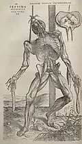 De humani corporis fabrica libri septem (nebst deren Auszug für Chirurgen), fertiggestellt 1542, erschien erstmals 1543 in Basel bei dem Verleger Johannes Oporinus. Vesalius hatte die Holzstöcke seiner Illustrationen, fertig geschnitten, zusammen mit den Probeabzügen nach Basel bringen lassen. Er selbst folgte 1543 nach und hielt in Basel im Mai unter Assistenz des Ratsherrn und zünftischen Wundarztes Franz Jeckelmann (später Schwiegervater von Felix Plater) ein berühmt gewordenes[12] anatomisches Kolloquium ab. Das hierbei von Vesalius präparierte sogenannte Vesalsche Skelett ist noch heute erhalten und das älteste Stück der anatomischen Sammlung in Basel. Es soll 1543 aus den sterblichen Überresten des Straftäters Jakob Karrer von Gebweiler präpariert worden sein.
