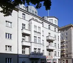 64 (117009): Der Altbau von 1887 war im Krieg im Vorderhaus erhalten geblieben, sodass die Instandsetzung zur Bewohnbarkeit in den 1950er Jahren erfolgte. Der Sanierungsstau wurde um 2000 mit dem Einbau eines Lifts, Anbau von Balkon und dem Ausbau des Dachgeschosses mit Kernsanierung am Gebäude aufgelöst. Die Wohnungen haben das Schlafzimmer zum Innenhof und Garten und das Wohnzimmer zur Straße.[188]