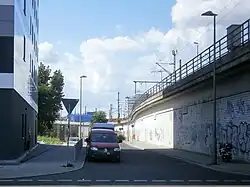 Bahnunterführung: Eine Eisenbahnbrücke, die in einer Breite von 60 m die Straße überdeckt, entstand bei der Umgestaltung des Bahnhofs.[19] Die Länge unter der Bahn war vorher 18 m. Die Andreasstraße hat eine Breite von 21 m Seit dem Bau der Stadtbahn um 1880 liegen Andreasstraße 6 und Andreasstraße 74 unter der Bahnüberführung.