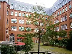 Gewerbliche Berufsschule (Lange Straße 31): Der zur Andreasstraße offene U-förmige Bau der Berufsschule blieb nach den 1940er Jahren erhalten. Das Schulgebäude lag im Innenblock hinter Andreasstraße 7–13 eingegrenzt an die Bahnstrecke mit Zugang über die Lange Straße 31.[79] Das Lehrerhaus stand Langestraße 31[80] 1870 war der Gärtner de la Croix Grundstückseigner und 1872 entstand der Rohbau der Andreas-Realschule auf Magistratsboden und 1873 hatte die Andreas-Realschule den Schulbetrieb (1874/1163: Director Hartung) aufgenommen. Als 1906 vom Andreas-Realgymnasium der Neubau im Innenblock zwischen Andreas- und Koppenstraße bezogen wurde, zog (1907/3043) die Städtische Pflichtfortbildungsschule des 5. Bezirks in das Schulhaus ein. Sie war nach dem Ersten Weltkrieg als Gewerbliche Berufsschule (Maler- und Maurerfachschule) weitergeführt worden. Im Zweiten Weltkrieg überstand das Schulhaus mit Bombenschäden im Karree und es war nach Wiederherstellungsarbeiten weiterhin nutzbar. Seit den 1950er Jahren hatte die Betriebsberufsschule (BBS) des VEB Technische Gebäudeausrüstung darin seinen Sitz, als diese vom VEB abgetrennt wurde unter Berufsschule für Blechbearbeitung und Installation. In den 1970er Jahren war sie als BBS „Michael Niederkirchner“ ausgewiesen. Die Berufsschule (Lange Straße 31) wurde nach der politischen Wende 1990 anfangs noch als Berufsschule genutzt. Das Gebäude blieb bestehen und stand nach dem Auszug der Schule bis Mitte der 1990er Jahre leer.