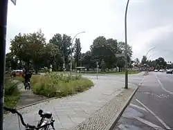 In Höhe des jetzigen Grundstücks Andreasstraße 21a, das straßennah die von den kriegszerstörten Wohnhäusern Andreasstraße 23–25 bestandene Grundstück ersetzt, liegt ein Spielplatz.[108] Vor diesem Spielplatz an der Straße liegt eine Grünfläche mit ausgewachsenen Bäumen in der die Skulptur Handwerker mit Sohn steht.