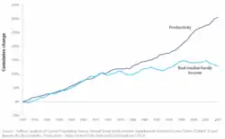 - ↑ Productivity growth closely matched that of median family income until the late 1970s when median American family income stagnated while productivity continued to climb ( des vom 4. September 2014 im Internet Archive) Info: Der Archivlink wurde automatisch eingesetzt und noch nicht geprüft. Bitte prüfe Original- und Archivlink gemäß Anleitung und entferne dann diesen Hinweis.. Source: EPI Authors' analysis of Current Population Survey Annual Social and Economic Supplement Historical Income Tables, (Table F–5) and Bureau of Labor Statistics Productivity – Major Sector Productivity and Costs Database (2012)