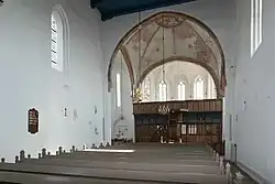 Ab etwa 1200 wurden Gewölbe nach angevinischem Vorbild in Westfalen errichtet. Als Auslöser wird vermutet, dass Bernhard II. zur Lippe als Gefolgsmann Heinrichs des Löwen diesen vorübergehend ins „englische“ Exil begleitete und dort die Baustelle der Kathedrale von Poitiers besuchte.[1] Die ersten Beispiele sind die Große Marienkirche in Lippstadt und die Kirche des ZisterzienserKlosters Marienfeld. Beide waren um 1200 äußerlich romanisch. Der Gewölbetyp breitete sich in Norddeutschland und den (damals noch nicht von Norddeutschland abgegrenzten) nördlichen Niederlanden aus und prägte die dortige Frühgotik (in den Niederlanden auch Romano-Gotik mit „melonenförmigen“ „westfälischen Gewölben“). Dabei kam es zu weiteren Entwicklungen: Schon in Marienfeld sind wie das (heute verputzte) Mauerwerk auch die Gewölbeschalen aus Backstein, nur die Rippen aus Sandstein. Ähnlich ist die Materialverwendung in den Gewölben der Bremer Liebfrauenkirche (wohl ab 1220), die als erste gotische Vierstützenhalle Norddeutschlands gilt. Schon Anfang des Jahrhunderts baute man die Stiftskirche Bassum abgesehen von wenigem Zierrat vollständig aus Backstein. Während in Westfrankreich die Gewölbeschalen überwiegend auf Kuff gemauert wurden, verwendete man östlich des Rheins überwiegend zirkuläre Steinlagen. Da dort die meisten Gewölbe verputzt wurden, wirkte sich das aber nur selten auf das Erscheinungsbild aus. Bei vielen Dorfkirchen liegen jedoch die Kämpfer weit unterhalb der halben Raumhöhe, was es allerdings auch bei Höhenreliefs nach dem Muster der Île-de-France gibt.