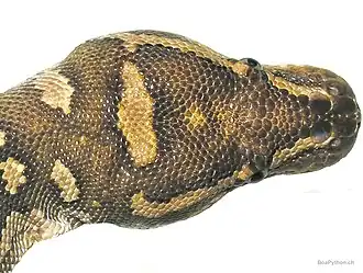 Für die Art kennzeichnend, sind die meisten Schilde auf der Kopfoberseite sowie auf dem Rücken und den Flanken auffallend gewölbt und nur gering bis gar nicht überlappend.[10][1] Das Rostrale (Schnauzenschild) hat, wie bei den meisten anderen Pythons auch, zwei tiefe Labialgruben. Die Nasenlöcher sind jeweils im oberen hinteren Teil des auf der Kopfseite gelegenen, großen Nasale (Nasenschild) positioniert. Zur Kopfmitte hin sind die Nasalia von einem Paar großer Internasalia (Zwischennasenschilde) separiert, welches zur Mittellinie hin selbst durch mehrere kleine Schilde getrennt wird.[2] Von der Schnauzenspitze her entlang der Mittellinie der Kopfoberseite folgen den Internasalia ein großes Paar Präfrontalia (Vorstirnschilde), welches auf Grund von mehreren kleinen Schildreihen auf der Mittellinie ebenfalls den Kontakt zueinander verloren hat. Charakteristischerweise, ist die dahinter folgende übrige Kopfoberseite komplett von zahlreichen kleinen, rundlichen Schilden bedeckt; Frontalia (Stirnschilde) und Parietalia (Scheitelschilde) sind durch die starke Fragmentierung nicht mehr auszumachen.[4] Um das Auge liegt ein Ring aus 15 bis 18 ähnlichgroßer, kleiner Circumorbitalia (augeumfassende Schilde), wovon meist fünf bis sechs auf die Infraocularia (Unteraugenschilde)[11] entfallen. Gelegentlich ist von den Circumorbitalia ein Supraoculare (Überaugenschild) vergrößert.[6] Auf der Seite des Kopfes zwischen Auge und Nasenloch liegt ein Areal mit zahlreichen kleineren und größeren Lorealia (Zügelschilden). Von den 14 bis 15 Supralabialia (Oberlippenschilden) tragen die vordersten drei große, tiefe,[2] dreieckige Labialgruben und die dahinter folgenden zwei bis drei eine kleinere, oberflächlichere[2] Labialgrube. Gelegentlich ist das Supralabiale Nummer 11 oder 12 horizontal geteilt.[4] Infralabialia (Unterlippenschilde) gibt es 15 bis 16, wovon 3 bis 4, bei Infralabiale Nummer 9 oder 10 beginnend, relativ oberflächliche Labialgruben besitzen.[6]