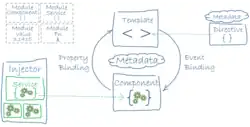 Architektur einer Angular-Anwendung. Die wesentlichen Bausteine sind Module, Komponenten, Templates, Metadata, Databinding, Direktiven, Services und Dependency Injection.