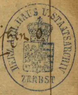 Ein festes Kanzleiwesen scheint sich in Anhalt erst gegen Ende des 13. Jahrhunderts entwickelt zu haben.[1] Schriftlich fassbar wird ein anhaltisches Archivwesen im Jahr 1339, als Abt Eckart von Ballenstedt den Fürsten Albrecht und Waldemar von Anhalt eine Urkunde über den Verkauf des Dorfes Niendorf mit seinem Abtssiegel bestätigt. Dabei erwähnt er, dass es eine frühere Urkunde zum gleichen Verkauf mit dem Siegel des Ballenstedter Kapitels gibt: „littere predicte recondite sunt in Cerwist cum aliis litteris dictorum principum“,[2] und belegt so, dass es in Zerbst ein fürstliches Archiv gegeben hat. Es ist davon auszugehen, dass auch andere anhaltische Fürsten ein solches Archiv unterhalten haben.[3] Mit der Vereinigung der anhaltischen Linien im ausgehenden 16. Jahrhundert wurde die Überlieferung im Dessauer Schloss als Gesamtarchiv zusammengeführt, nach der erneuten Teilung des Fürstentums bildeten sich mehrere Linienarchive in den jeweiligen Residenzen, bis nach dem erneuten Zusammenfall 1863 die Gründung eines eigenen Archivs erforderlich wurde. Die Wahl fiel auf den Standort Zerbst, wo das Herzoglich Anhaltische Haus- und Staatsarchiv 1872 Räume im Corps de logis und Ostflügel des Schlosses bezog. Es war dem Herzoglichen Staatsministerium zugeordnet. Infolge des Gesetzes über die Auseinandersetzung mit dem früheren Herzoglichen Hause und des darauf basierenden Auseinandersetzungsvertrags vom 23. Juli 1919 erfolgte eine Trennung der Bestände des Herzoglichen Hausarchivs von den staatlichen Beständen, die beide im Zerbster Schloss verblieben. 1920 wurde das Zerbster Stadtarchiv ebenfalls dorthin überführt.