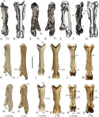 Dem Carpometacarpus scheint, im Gegensatz zu den rezenten Anhinga-Arten, ein charakteristischer, kammartiger Knochenfortsatz am distalen Ende des Os metacarpale majus zu fehlen.[2]